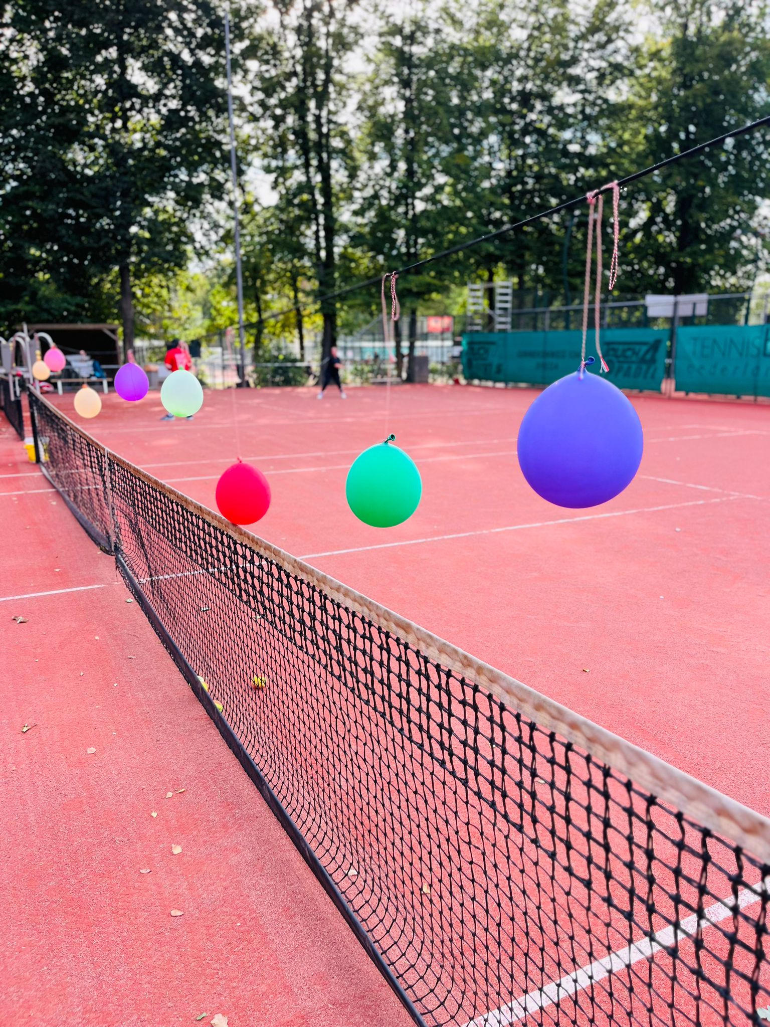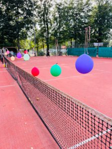 - en ballonnen raken die boven het net hingen
